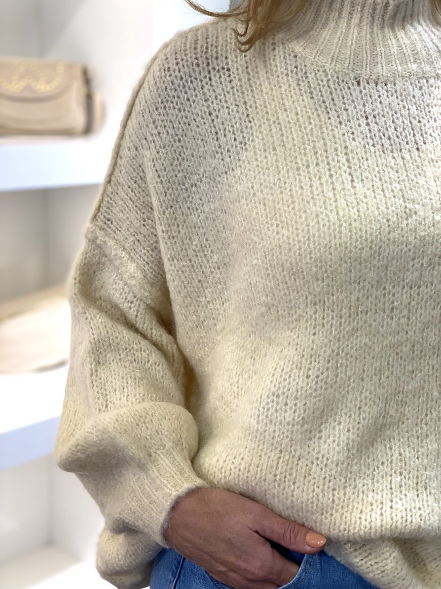 De 89396 trui van Azzurro is een grofgebreide trui in een los model, met ballonmouwen en een hogere kraag.