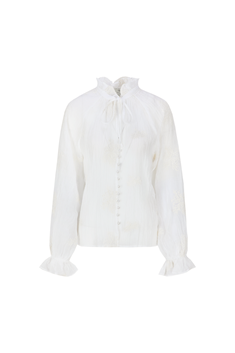 De Lyra blouse is een verfijnde blikvanger met een romantische twist. Het semi-transparante materiaal en het subtiele borduursel creëren een luchtige, vrouwelijke uitstraling. De opstaande kraag met strikdetail en de licht geplooide mouwen met rucherand geven het ontwerp een charmante, elegante touch. Perfect te combineren met een pantalon of denim voor een stijlvolle, tijdloze look.