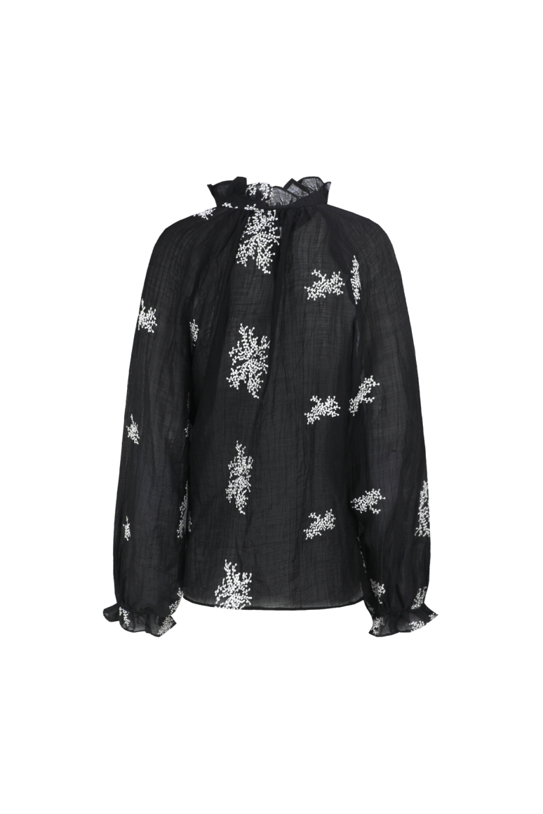 De Lyra blouse is een verfijnde blikvanger met een romantische twist. Het semi-transparante materiaal en het subtiele borduursel creëren een luchtige, vrouwelijke uitstraling. De opstaande kraag met strikdetail en de licht geplooide mouwen met rucherand geven het ontwerp een charmante, elegante touch. Perfect te combineren met een pantalon of denim voor een stijlvolle, tijdloze look.