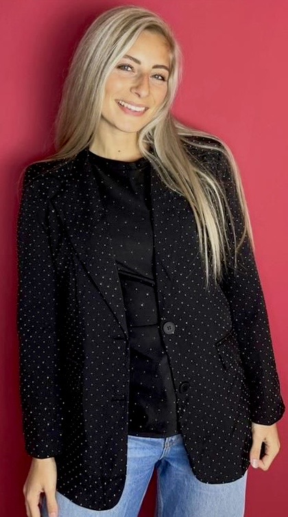 Deze prachtige blazer is afgewerkt met glitter strass steentjes. De blazer is voorzien van een klassieke reverskraag, een knoopsluiting en faux klepzakken.