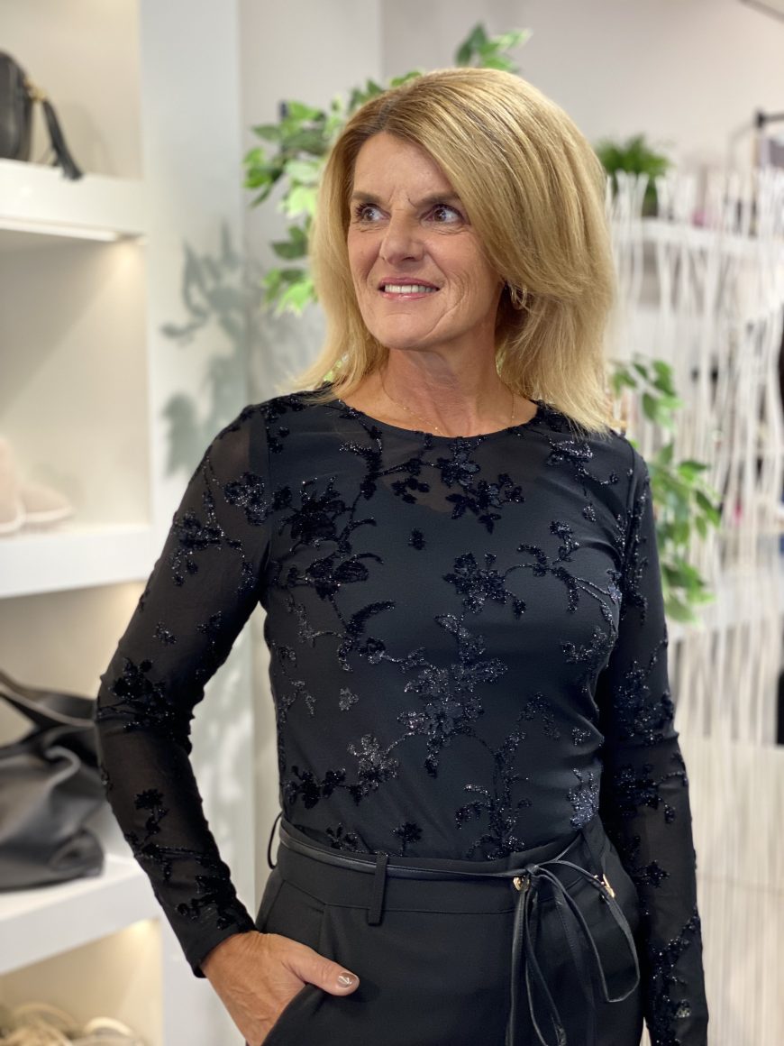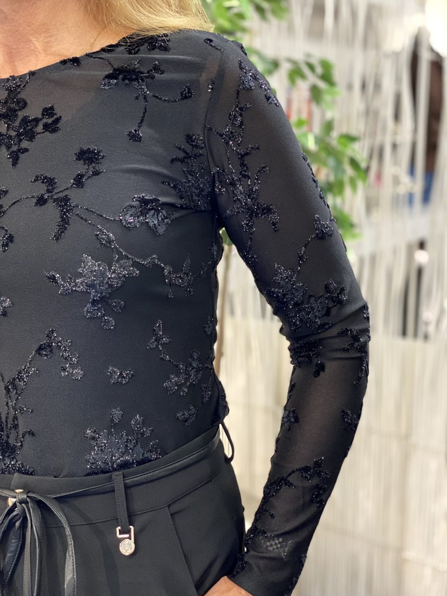 De Biska top van Freequent is een top in een transparante en rekbare mesh stof met een bloemenpatroon en een glanzende look. De top heeft een eenvoudig silhouet met een strakke pasvorm, lange mouwen en een ronde hals.