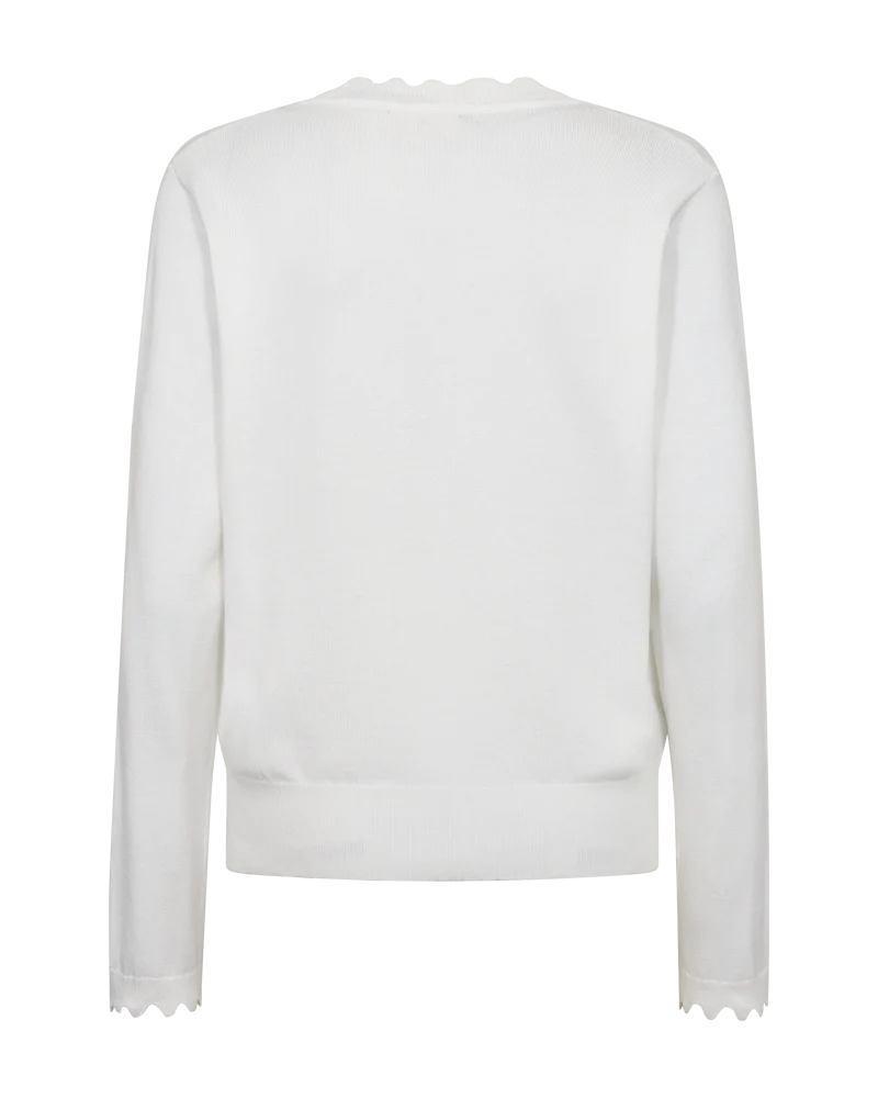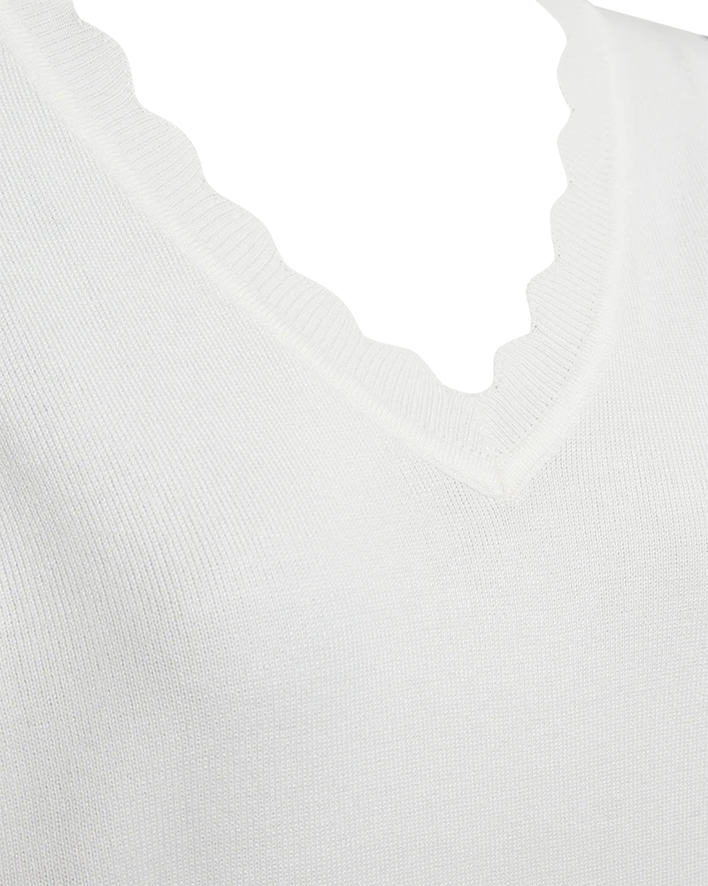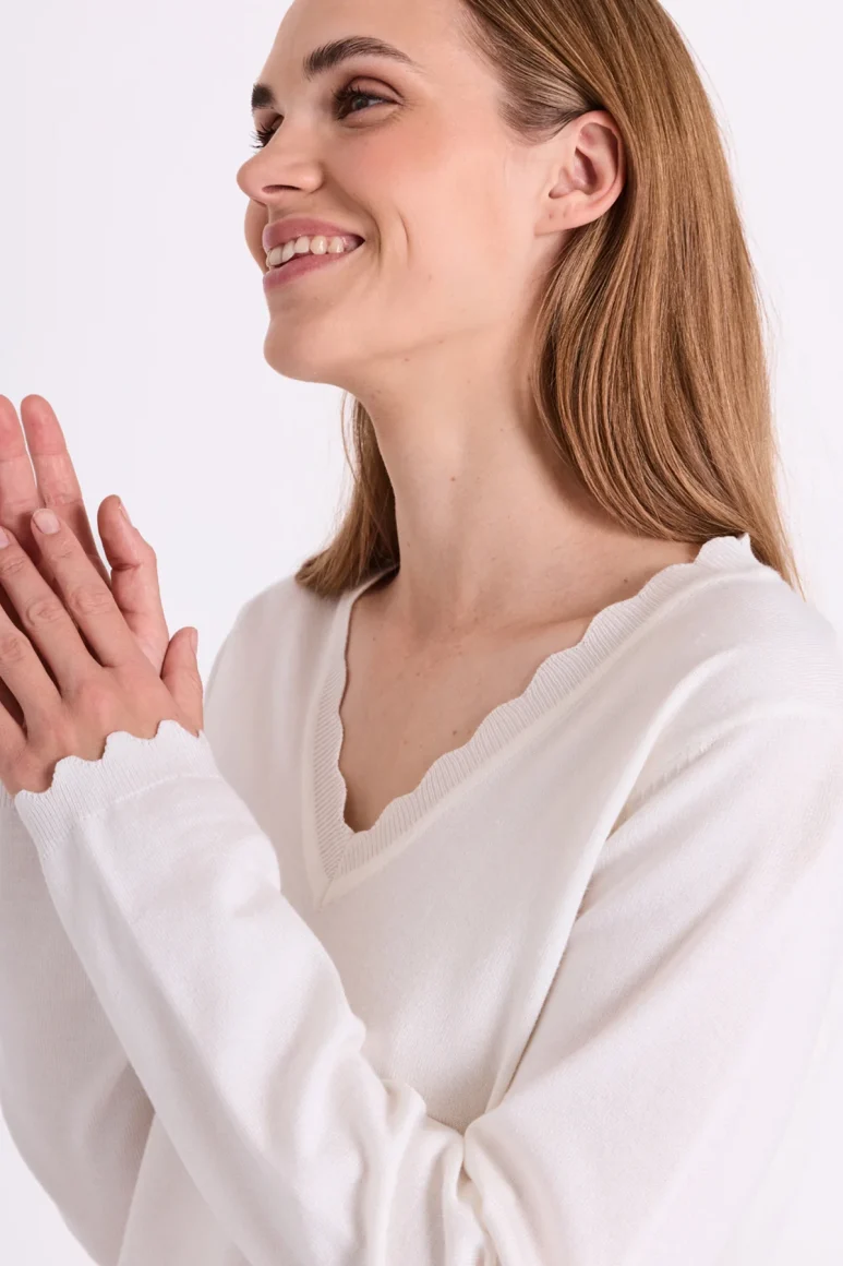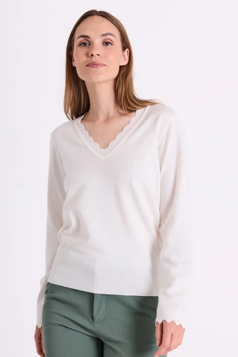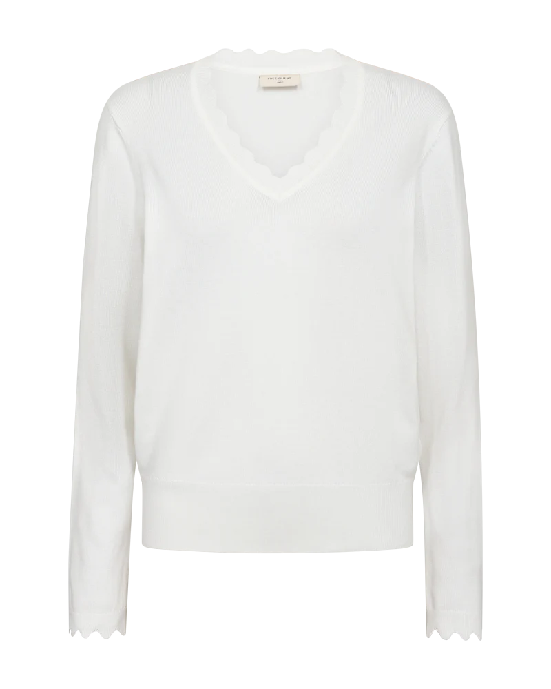 De Katie pullover van Freequent is een zachte, fijngebreide trui. De trui heeft een eenvoudig silhouet met lange mouwen, een V-hals, een losse pasvorm en een sierlijke geschulpte rand.