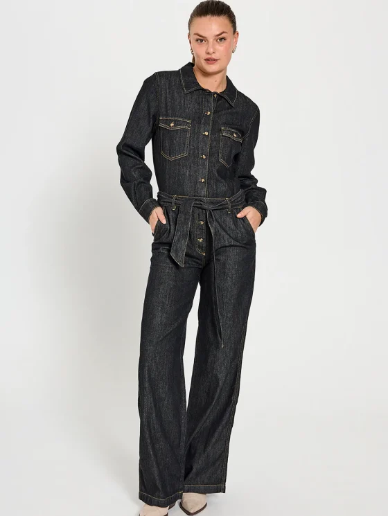 De Lisea jumpsuit van Freequent is een prachtige jumpsuit in een zacht materiaal met een denimlook. De jumpsuit heeft een regular fit aan de bovenkant met een klassieke kraag, lange mouwen, een knoopsluiting en een strikkoord in de taille. Daarnaast heeft de jumpsuit lange, wijde pijpen, borst- en zijzakken en contrasterende stiksels voor een mooie touch.