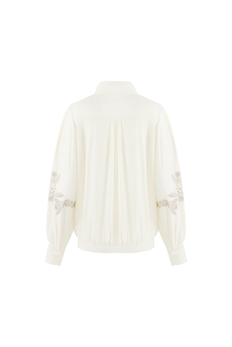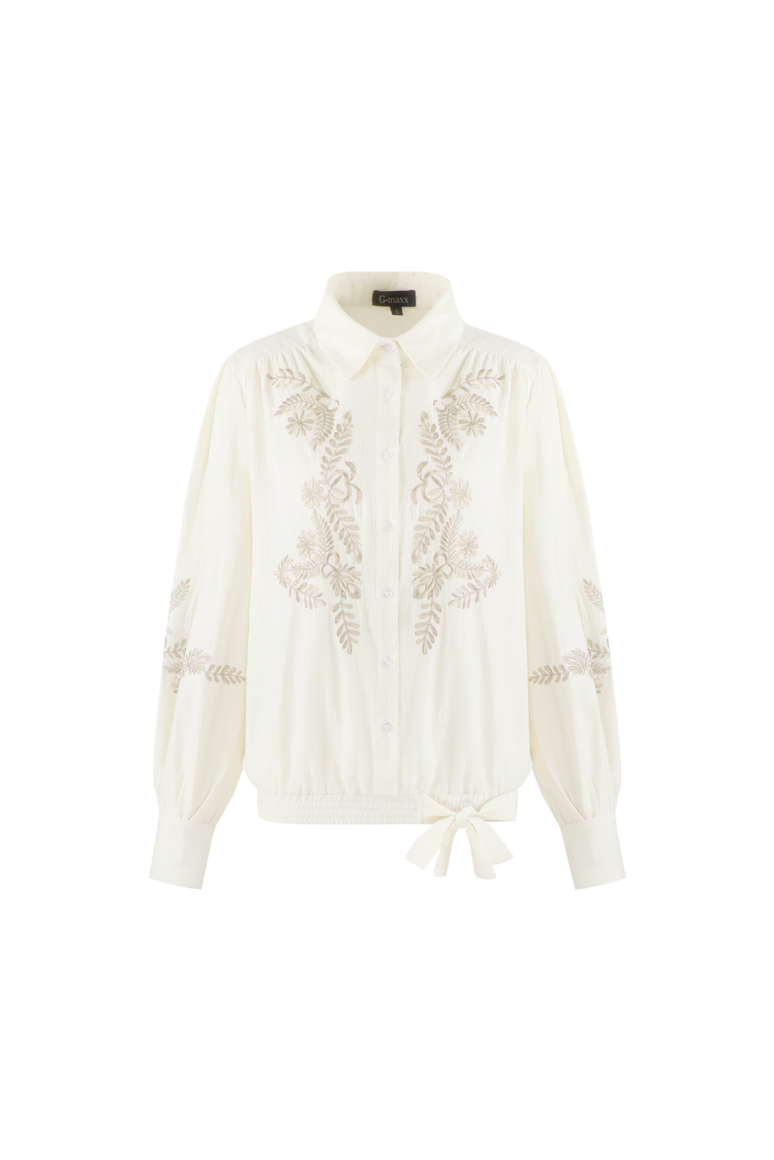De Hana blouse van G-maxx is een verfijnde toevoeging aan je garderobe en straalt een vrouwelijke, elegante uitstraling uit. Het model heeft een zachte, soepel vallende fit met subtiele plooien die zorgen voor een flatterend silhouet en extra bewegingsvrijheid. De fijne borduursels geven de blouse een luxe en ambachtelijk karakter, terwijl de klassieke kraag en knoopsluiting zorgen voor een tijdloze balans. De tailleband met strikdetail voegt een speels accent toe en maakt het geheel mooi in proportie. Deze blouse laat zich moeiteloos combineren en is perfect voor zowel een verzorgde dagelijkse look als een meer geklede gelegenheid.