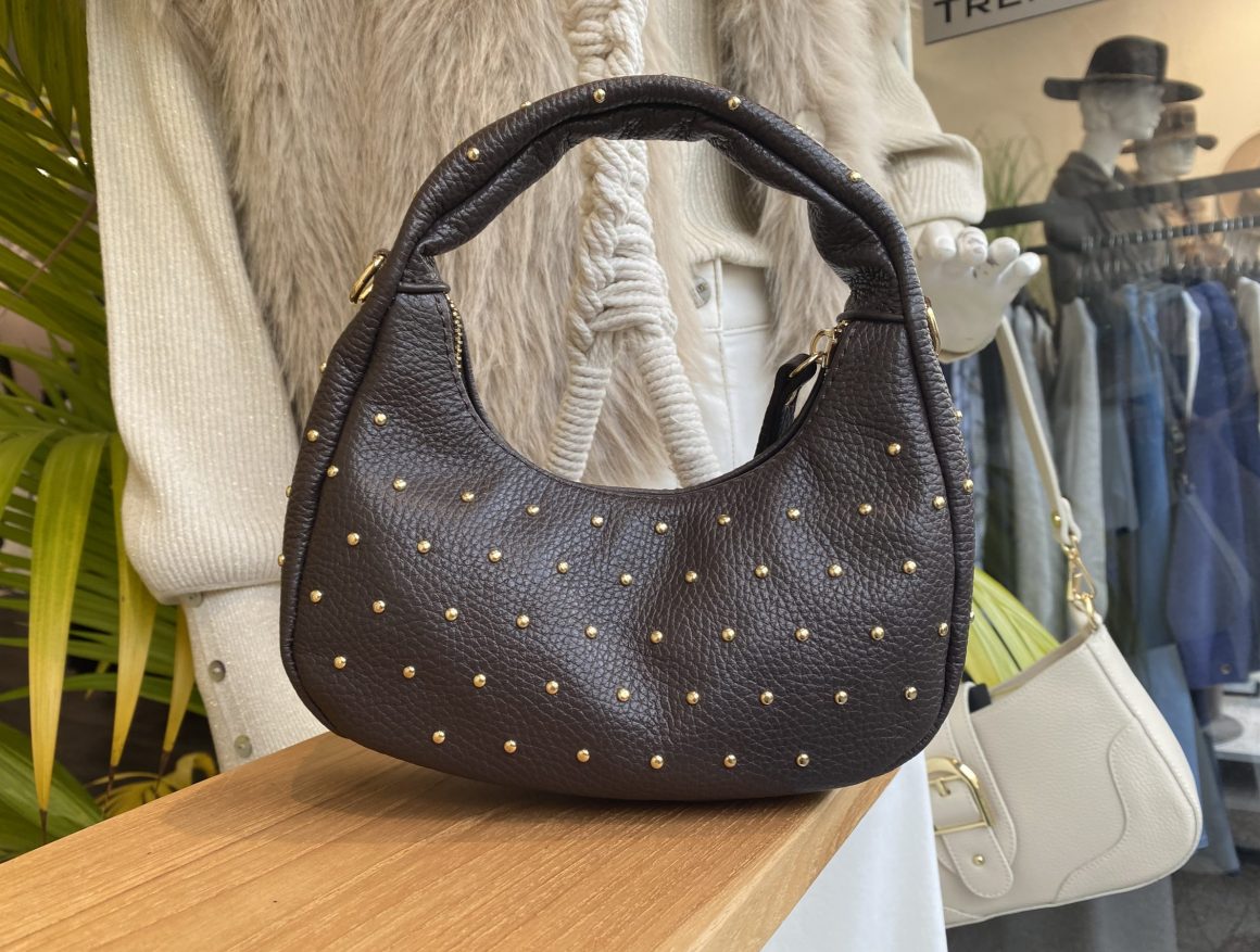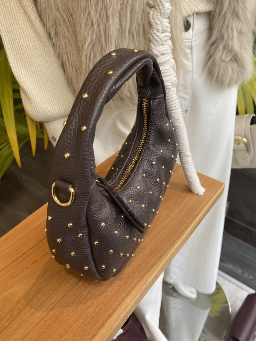 4Fashion / Mode / Accessoires / Handtas Lala Leer Studs Donkerbruin/Goud T317