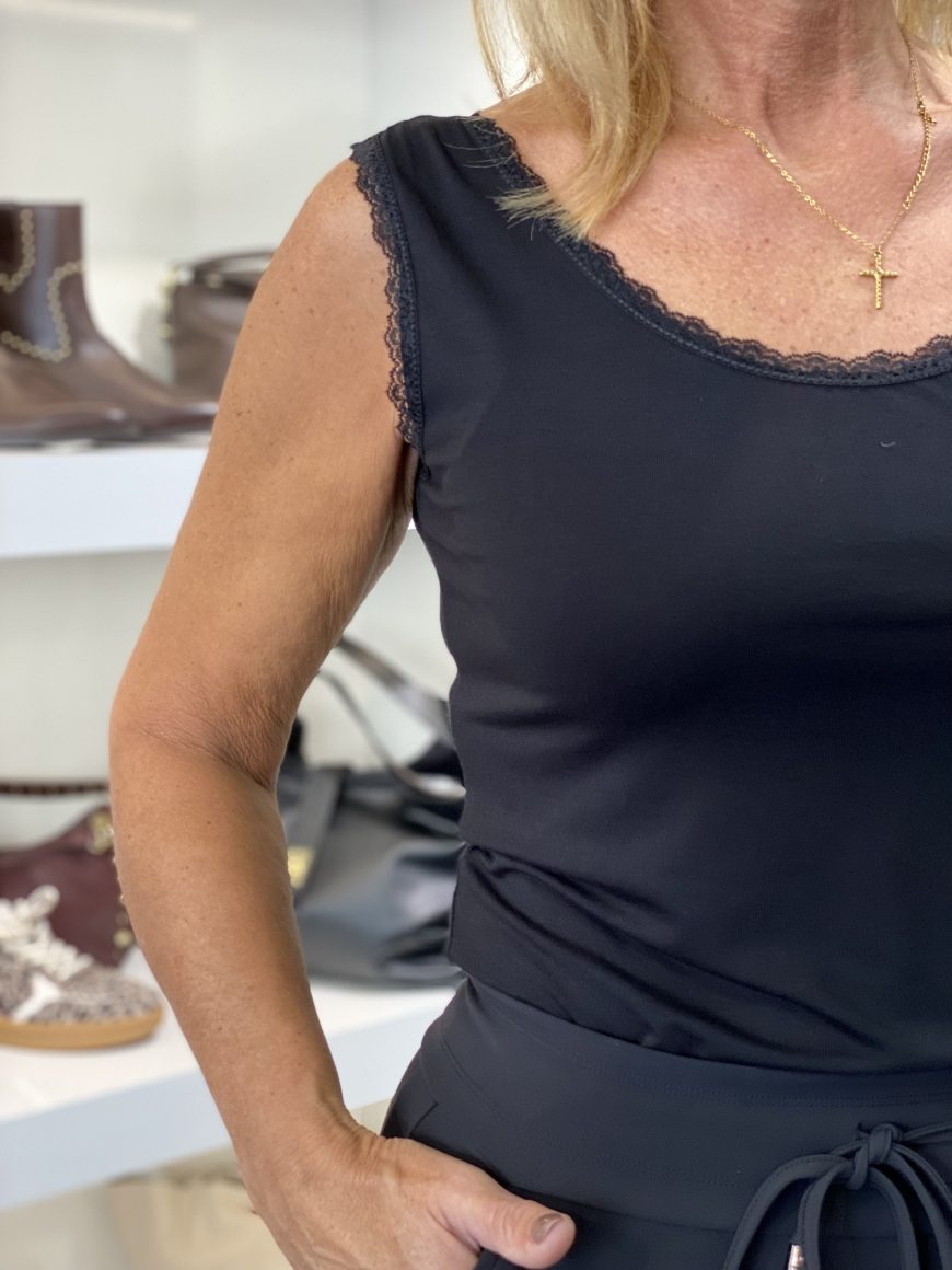 De Valentine top is een prachtige mouwloze basic met een ronde hals, gemaakt uit een zacht viscose. De top is afgewerkt met kant aan de halslijn en de schouders.