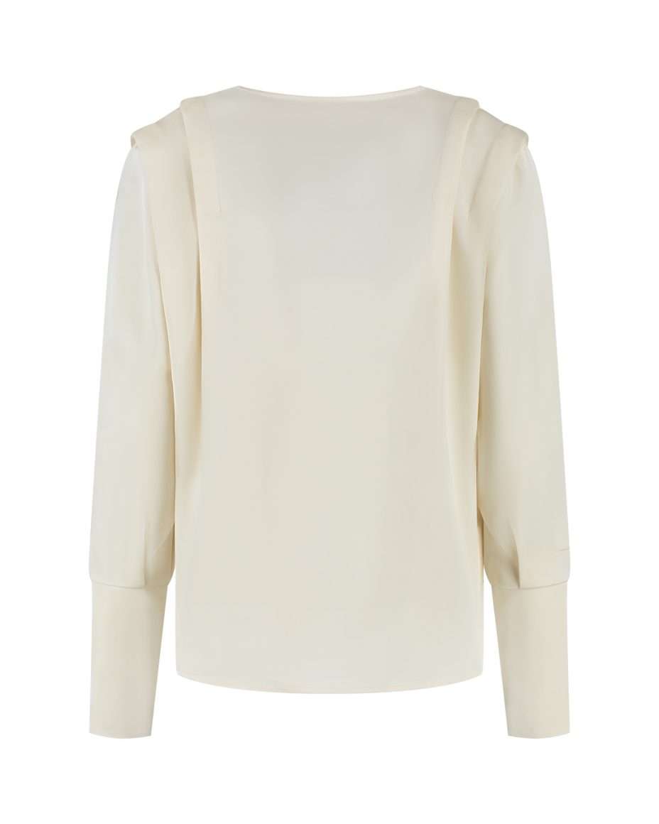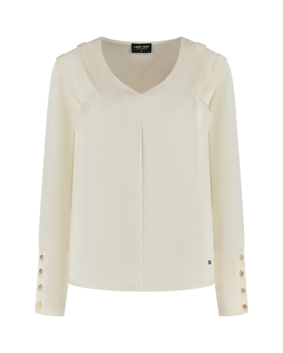 De Sheri top van Lady Day is een comfortabele top voorzien van een elegante V-hals en lange mouwen met gouden knoopjes. De top heeft een satijnen look en mooie plooien aan voor- en achterzijde over de schouders.