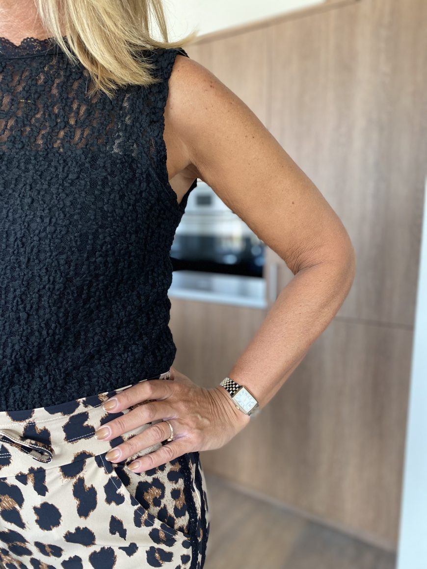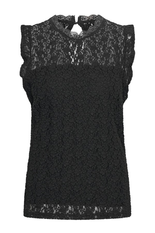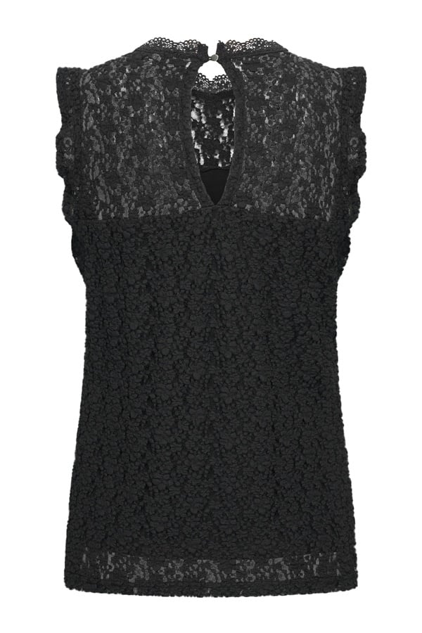 De 202693 top van Mi Piace is een mouwloze top afgewerkt met semi-transparante kanten stof. De top is voorzien van een elegante hoge hals, subtiele ruffle details op de schouders en sluit met een keyhole knoopsluiting op de rug. Draag deze vrouwelijke top met een pantalon of rok voor een avondje uit, of met een blazer voor een stijlvolle look.