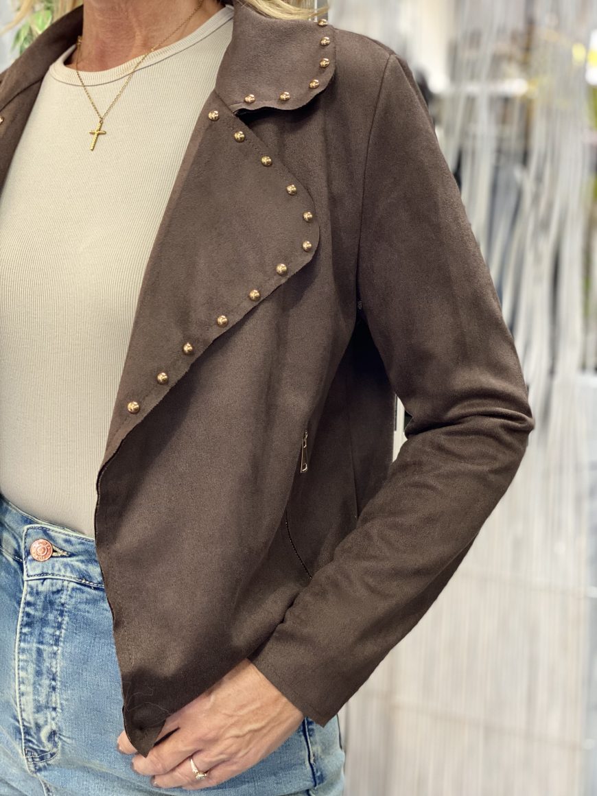 Comfy jasje van Musthaves by Elja met een suedine afwerking. Het jasje heeft een grote kraag afgewerkt met gouden studs en steekzakken met ritssluiting. Let op: dit jasje heeft geen sluiting en draag je open.