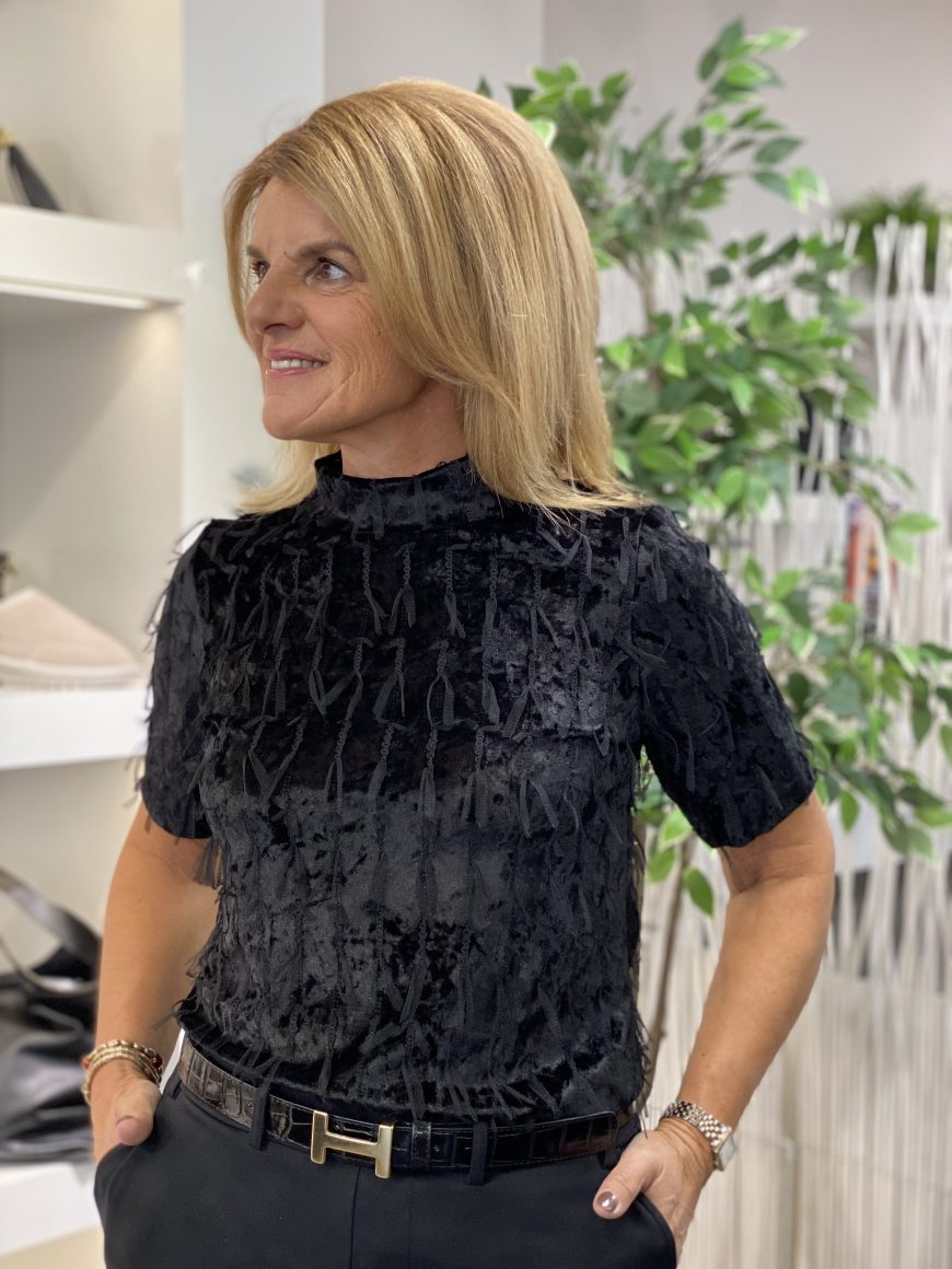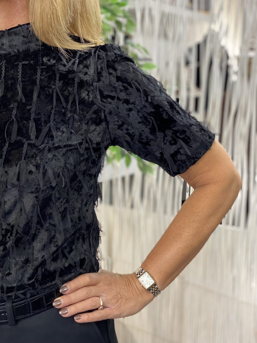 De Milans top van NED is een top die moeiteloos stijl en luxe combineert dankzij de velvet stof en de fringes. De top is voorzien van korte mouwen en een opstaande kraag.