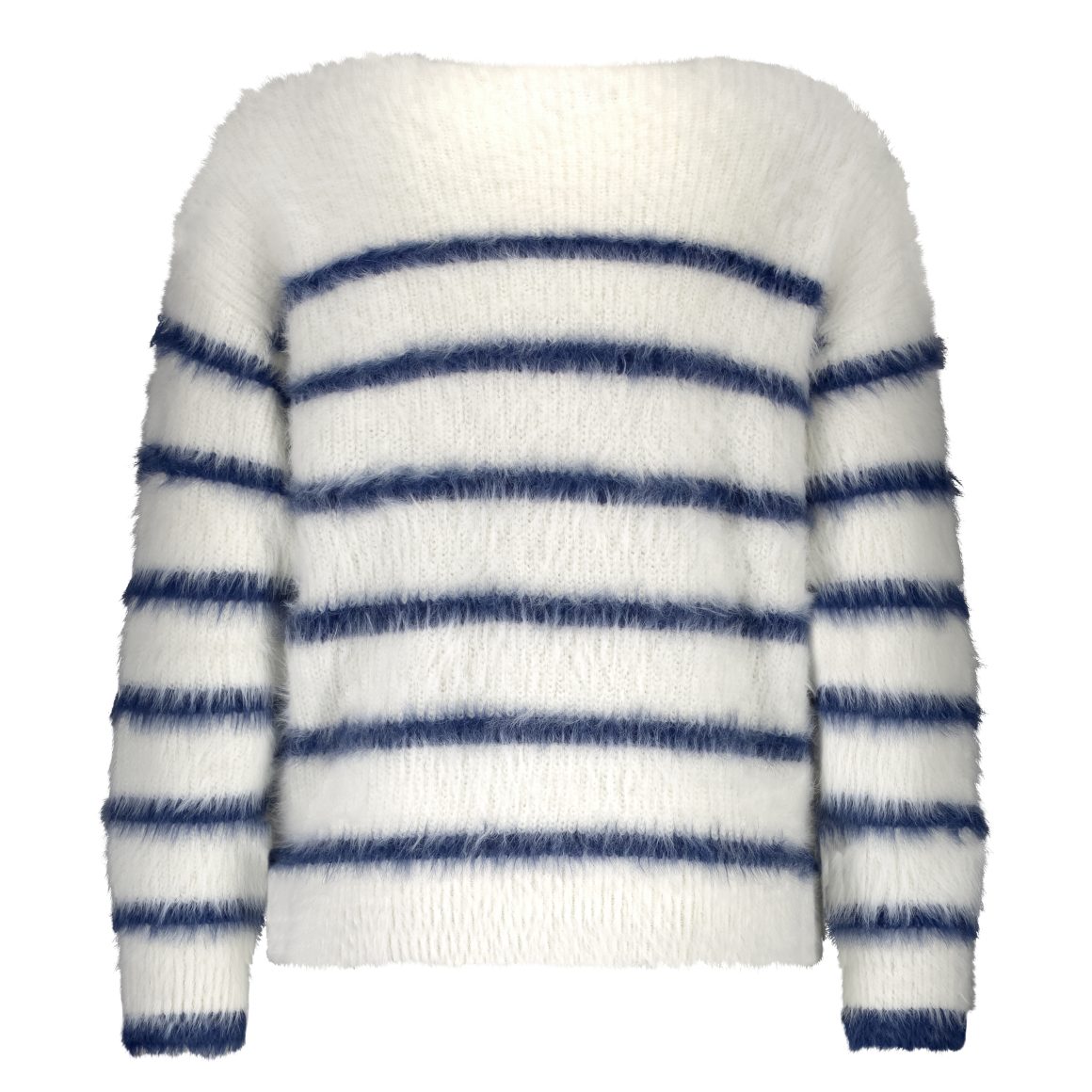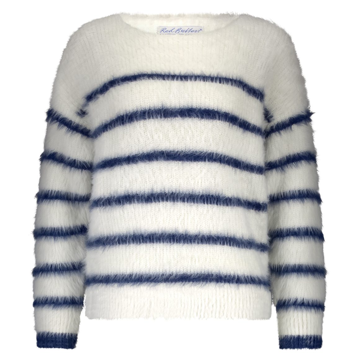 De Fuzzy Sweater & Stripe van Red Button is een fluffy trui met lange mouwen en een ronde hals. De trui is gemaakt van een langharig zacht breisel en heeft een gestreept motief.