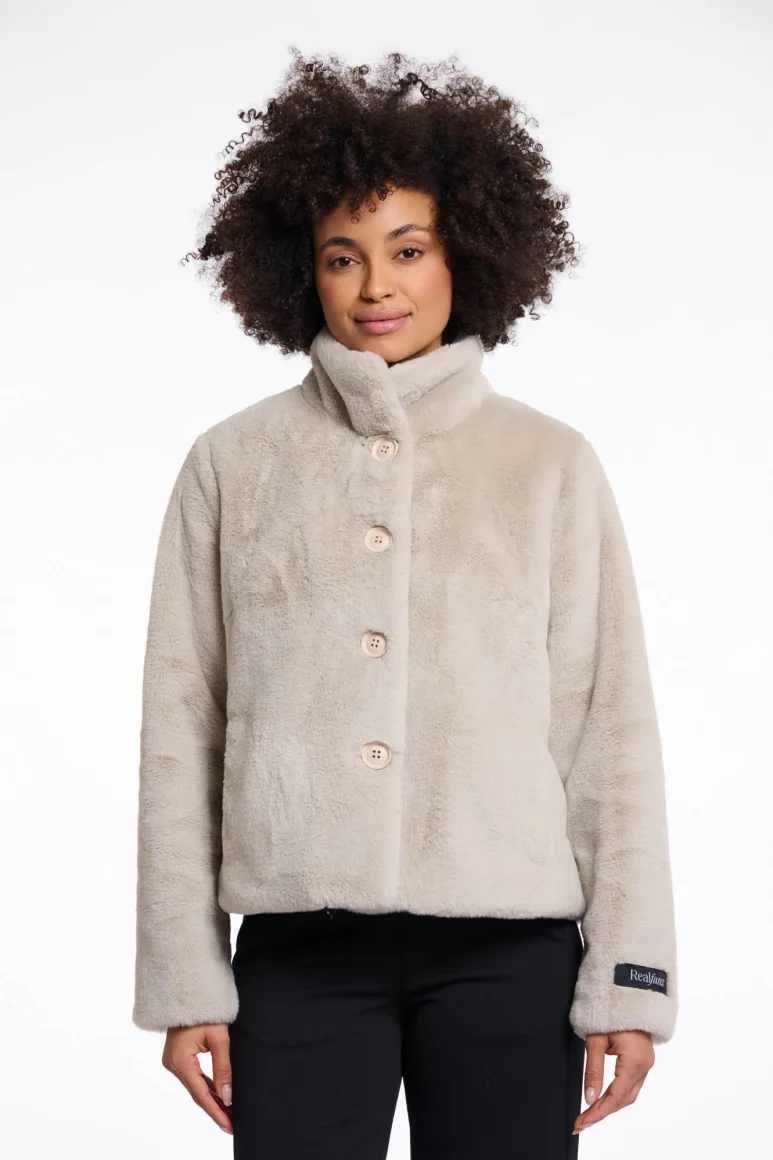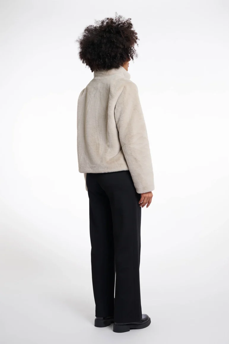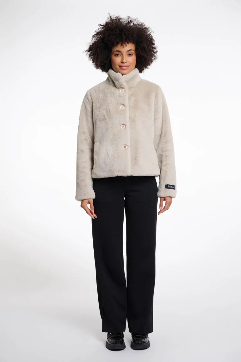 De Vie jacket van Rino & Pelle is vrouwelijke jas in een kort model met een zachte teddy look. De jacket is voorzien van een hoge kraag, een knoopsluiting en een zachte, warme stof.