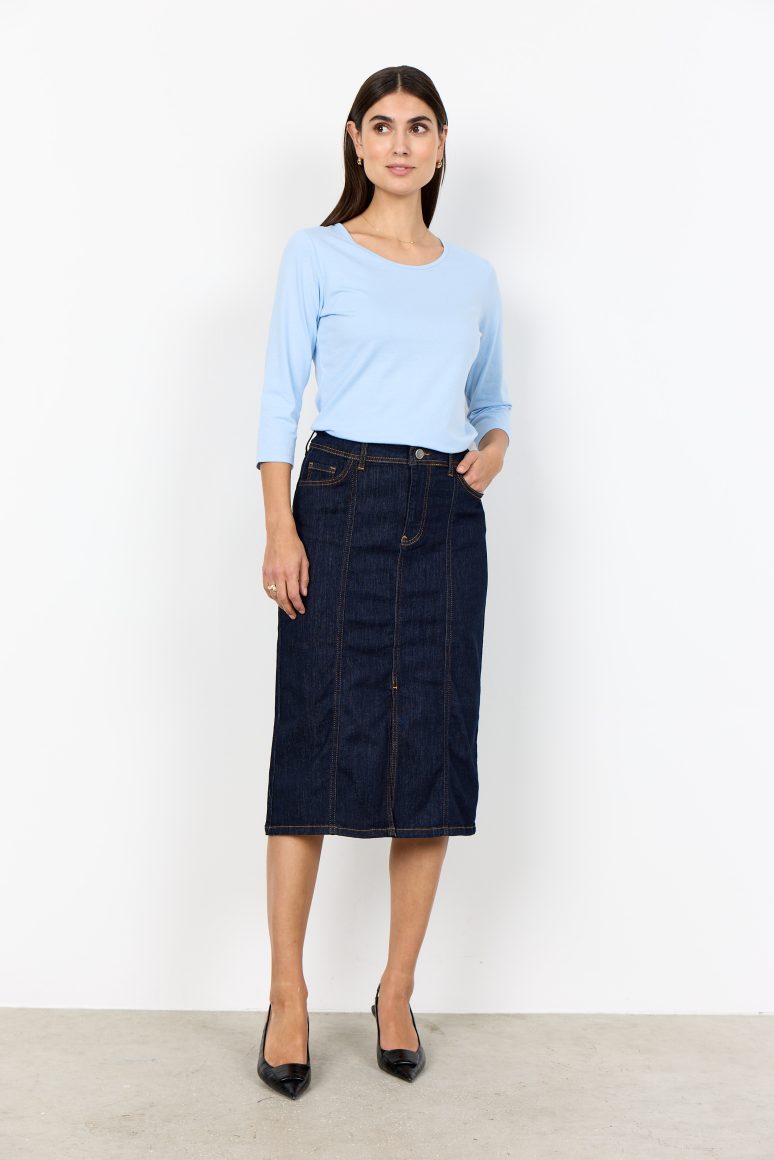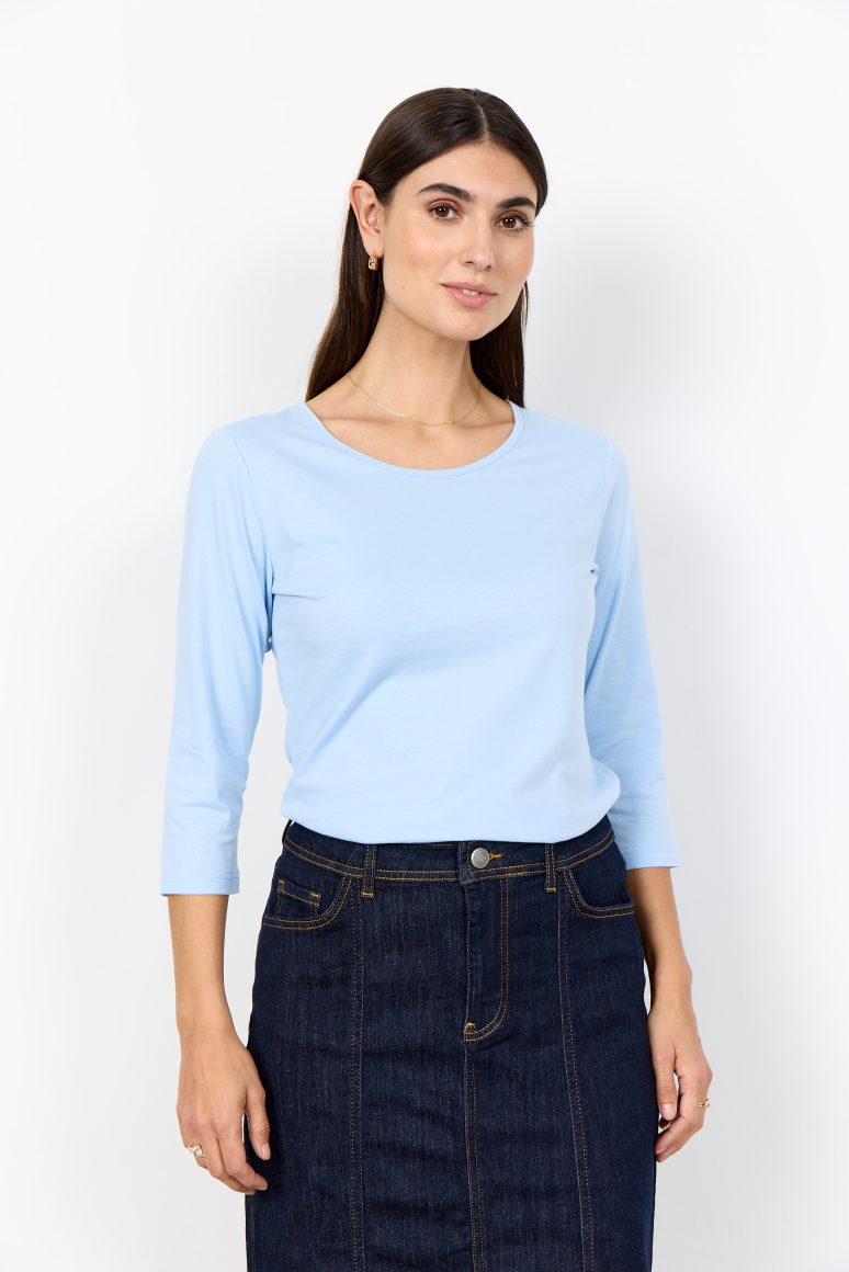 Het Pylle 32 top van SoyaConcept is een basic T-shirt van elastisch materiaal, waardoor het zeer comfortabel is. Het T-shirt heeft een eenvoudig ontwerp en is daarom een onmisbaar item in elke basisgarderobe. Het kan gecombineerd worden met een gebreide trui en een jeans.